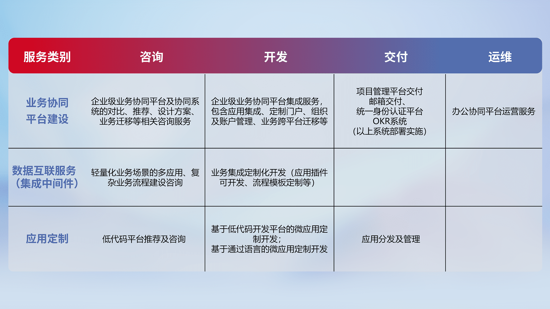 针对钉钉、、、、企微、、、、IDaas等平台级产品提供产品的规划、、方案、、交付、、、、定制化开发等服务,,,实现如统一协同办公、、、智能客户服务、、、混合会议管理、、智能数据查询、、、等业务场景,,实现数字化转型。。。。